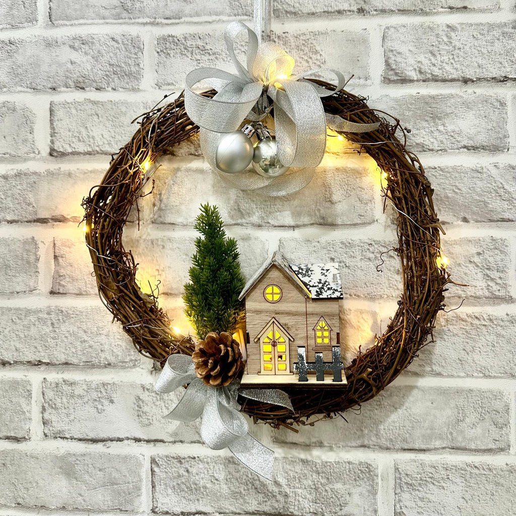 This simple yet charming wreath features a snowy white house that lights up, creating a warm, inviting glow. Wrapped in delicate fairy lights along a natural twig base, the wreath is accented with silver baubles and a miniature tree beside the house, evoking a peaceful winter scene.