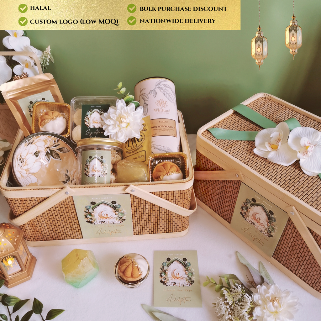 Beautifully presented in a premium wooden bamboo basket adorned with faux orchids, with the option for a custom logo - the perfect Raya gift for your esteemed clients, business partners, and employees.