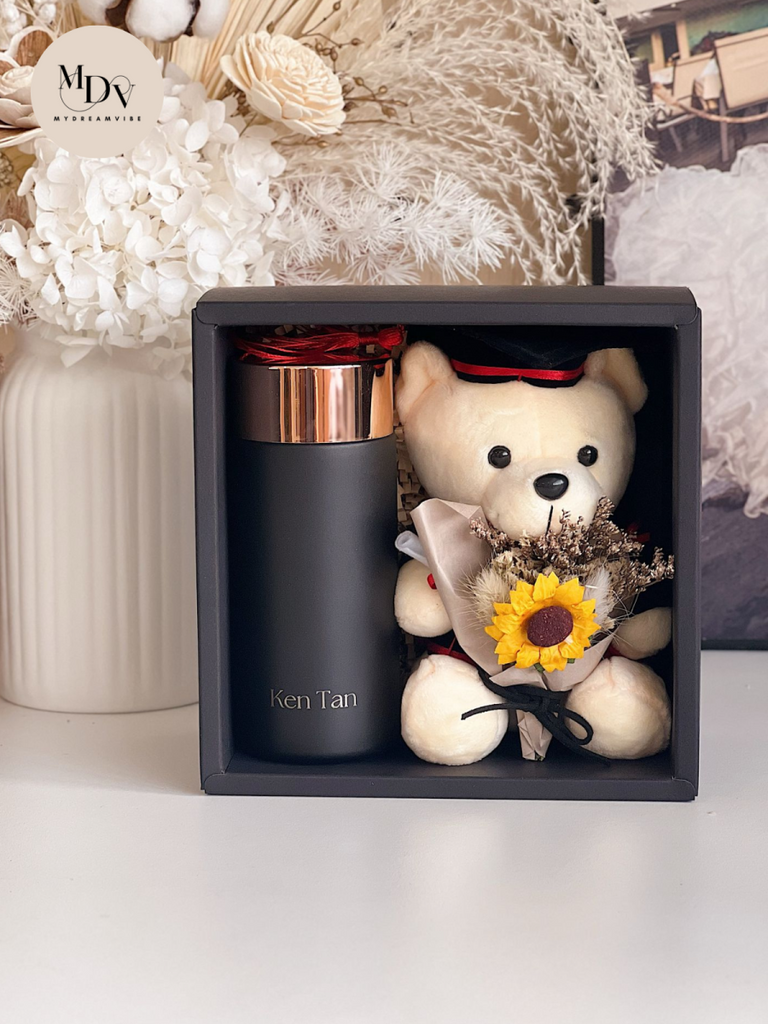 graduation bear standing at approximately 15cm tall. With its leakproof design and thoughtful packaging complete with shredded paper and a congratulations card, this gift is sure to make their special day even more memorable. Give them a gift they'll cherish forever!