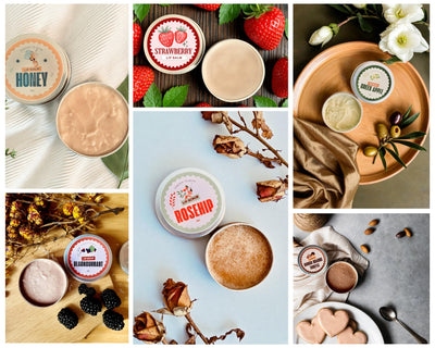 - Selection of lip balm: Raw Honey, Green Apple, Blackcurrant, Strawberry, Rosehip Lip Scrub, Chocolate Orange Truffle.