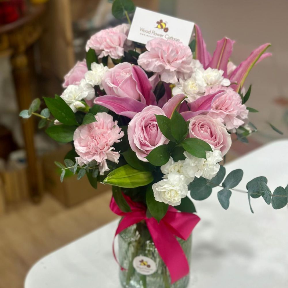 Wrap her heart in blooms with A Mother's Love — a graceful medley of pink roses, carnations, lilies, and delicate white blossoms, nestled in lush greenery and elegantly arranged in a ribbed glass vase adorned with a bold fuchsia ribbon. This bouquet is a tender tribute to the warmth, strength, and beauty of every mom. Whether she’s “Mama,” “Mum,” or “Mommy,” show her she’s cherished beyond words.