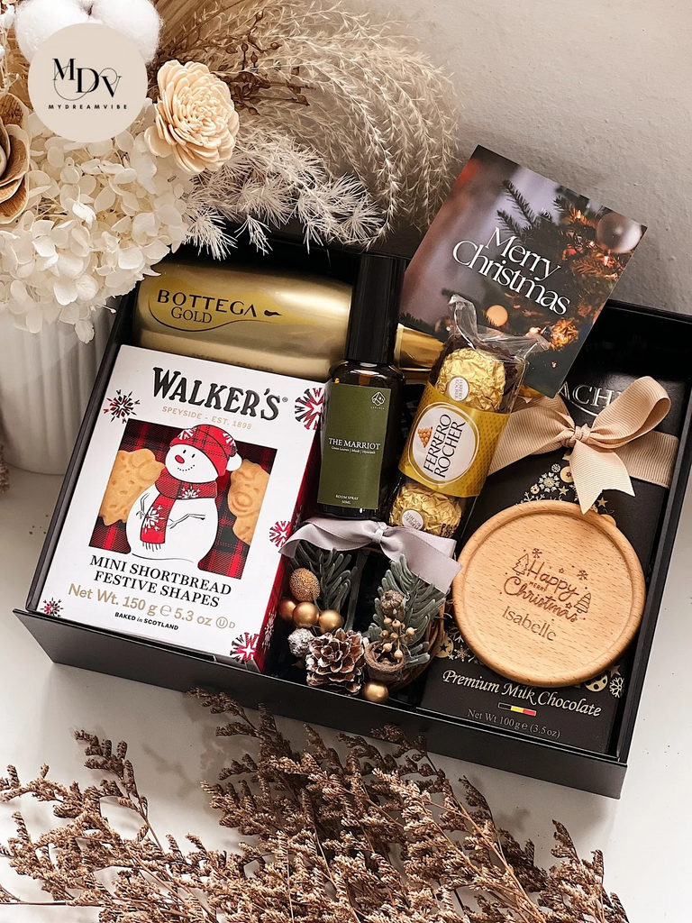 Inside, discover a touch of luxury with a mini bottle of Bottega Gold Champagne, the soothing aroma of The Marriott Room Spray, and a selection of classic festive favourites — buttery shortbread, smooth milk chocolate, and golden Ferrero Rocher. Thoughtfully finished with a personalised wooden coaster and festive ornaments, this gift set is wrapped in a sleek black magnetic box, ready to impress at every unboxing.