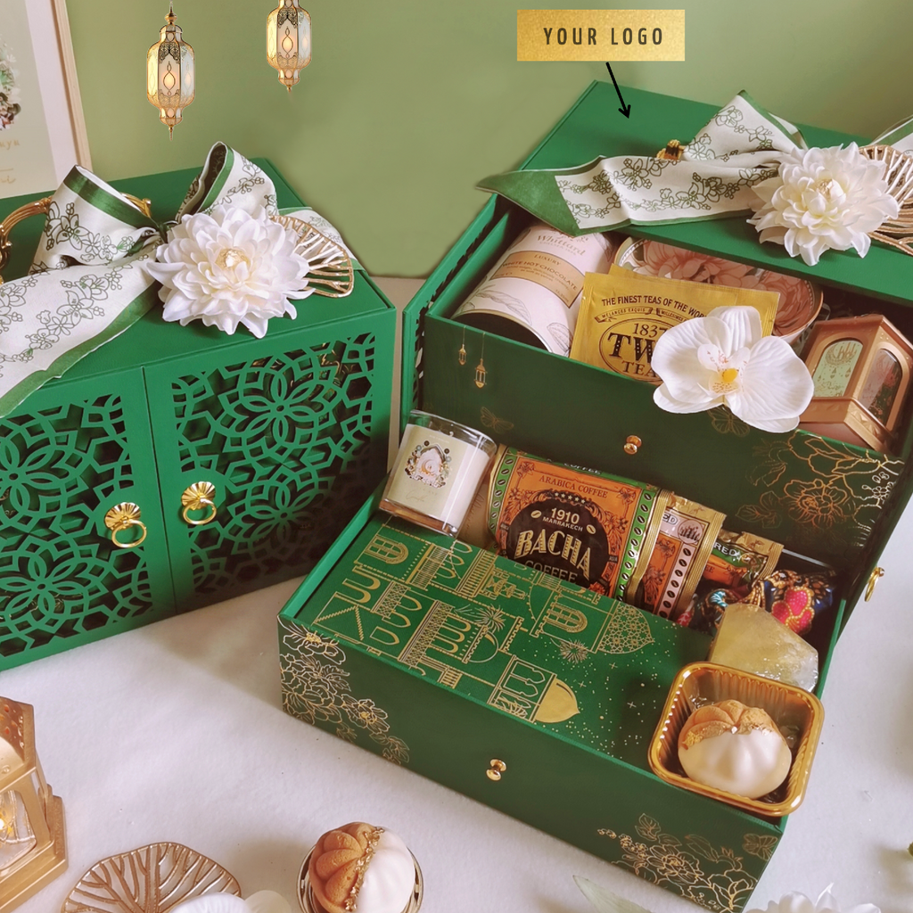 Spread blessings and gratitude this Raya with our Mewah gift set. Beautifully presented in a premium 2-tiered wooden drawer box, our Mewah gift set features the golden glow of Moroccan-inspired design with vibrant lush greenery, radiating elegance and joy this festive season.
