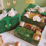 - 1x Premium Wooden Box with two-tiered drawer, magnetic door and gold handle. Adorned with golden Raya floral design, floral twilly, flower and gold leaf (size: 26.5cm x 18.5cm x 18cm) Add your logo on the giftbox with MOQ 30 units.