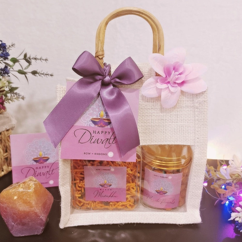 Celebrate the Festival of Lights with our stunning Diwali Delight giftset! Get a taste of the rich, authentic flavours of Diwali treats with our premium mixed muruku and masala peanuts. Presented in a reusable mini jute bag, this sustainable and heartwarming gift embodies the essence of Deepavali's spirit of togetherness and tradition - making it the ideal gift to express your appreciation and gratitude this festive season.