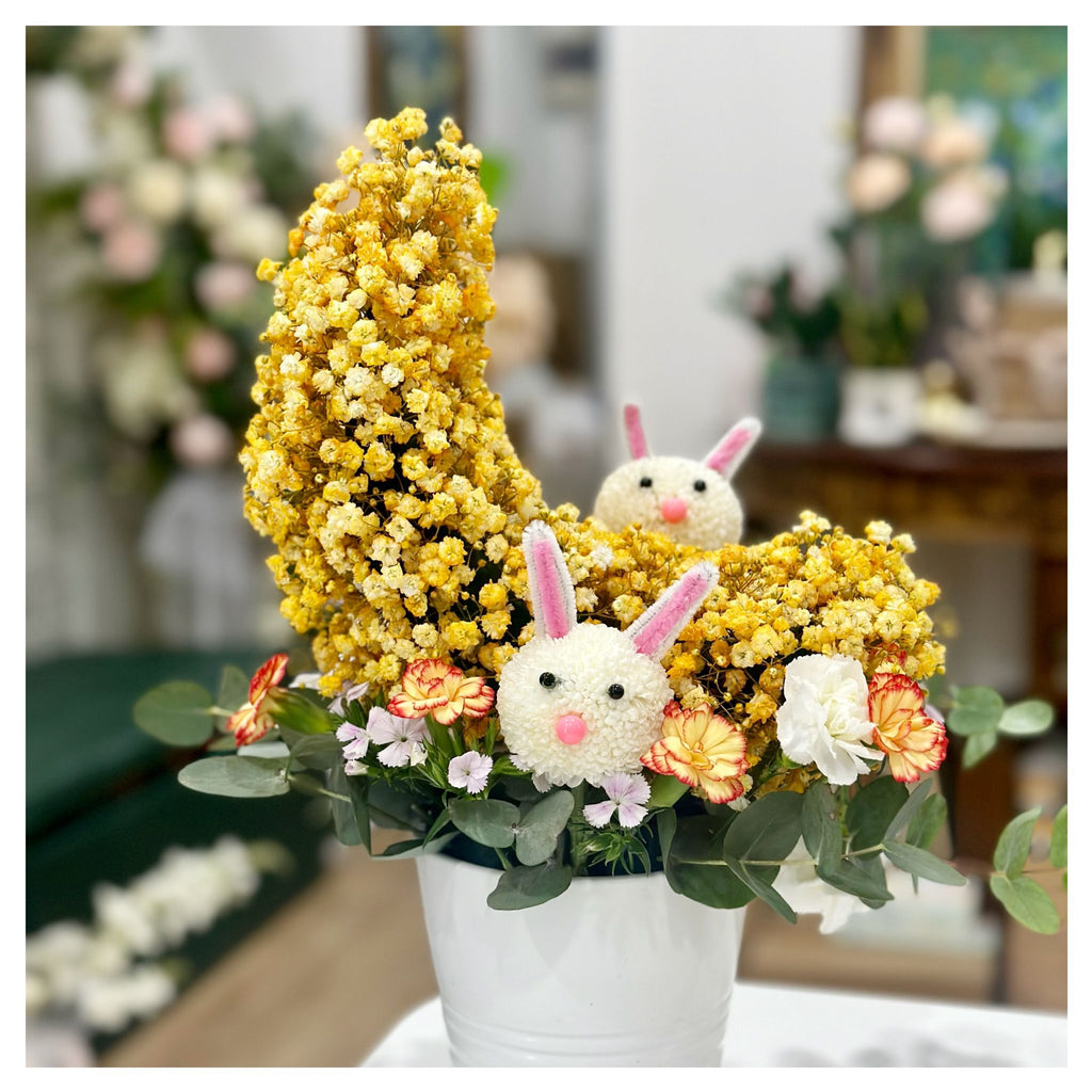 Step into a world of enchantment with "Rabbits by the Moonlight: A Mid-Autumn Delight." Our stunning arrangement brings the magic of the season to life as a radiant moon, crafted from delicate orange baby's breath, takes center stage. Surrounding this celestial masterpiece is a vibrant garden of hand-selected flowers, each petal telling a story of autumn's beauty.