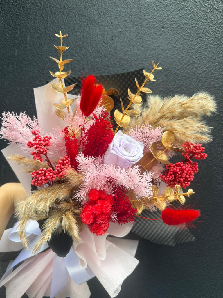 Note 1: 1 Preserved Rose and other fillers such as eucalyptus, baby breathe/caspia. Actual tone of flowers may differ slightly from image.