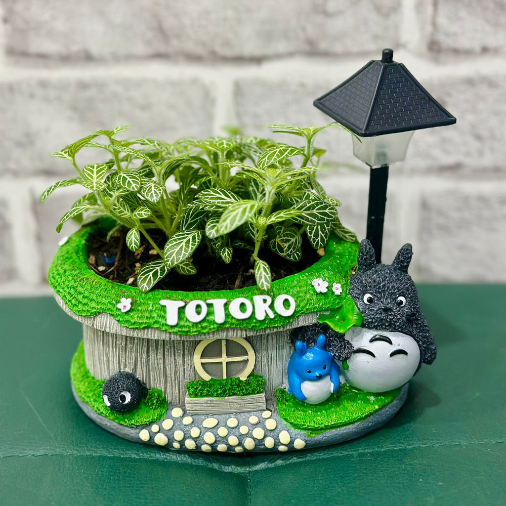Bring a touch of Studio Ghibli magic into your home with this adorable Totoro-themed plant pot. Featuring a lush Fittonia plant (nerve plant), this piece combines greenery with charm, making it perfect for desks, shelves, or bedside tables. The pot comes with a working lamp post that offers both warm and white light options, adding a cozy glow to your space day or night. A delightful gift for Totoro fans and plant lovers alike!