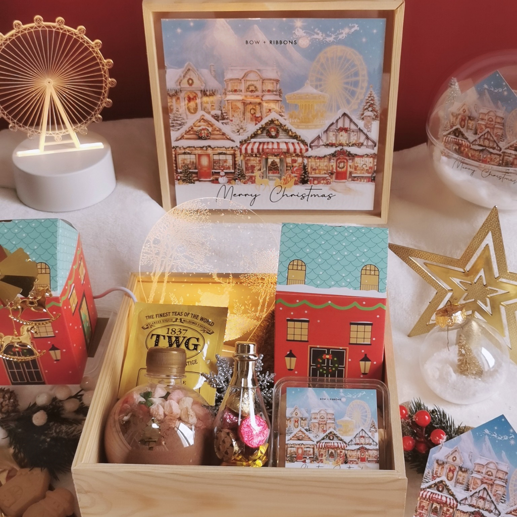 Introducing our Winterland giftset, featuring an elegant pinewood box inspired by the magic of the enchanted Winter Wonderland. Unwrap the magic of Christmas with gingerbreadman, red velvet cookies, delectable chocolates, rich hot chocolate, premium TWG tea, or Bacha coffee, paired with elegant glass cups—bringing the charm of a snowy Christmas village to life with every sip and bite!